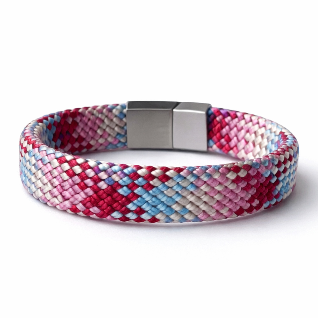 Płaska różowa bransoletka z flagowej kolekcji MonEgo wykonana z liny i stali.