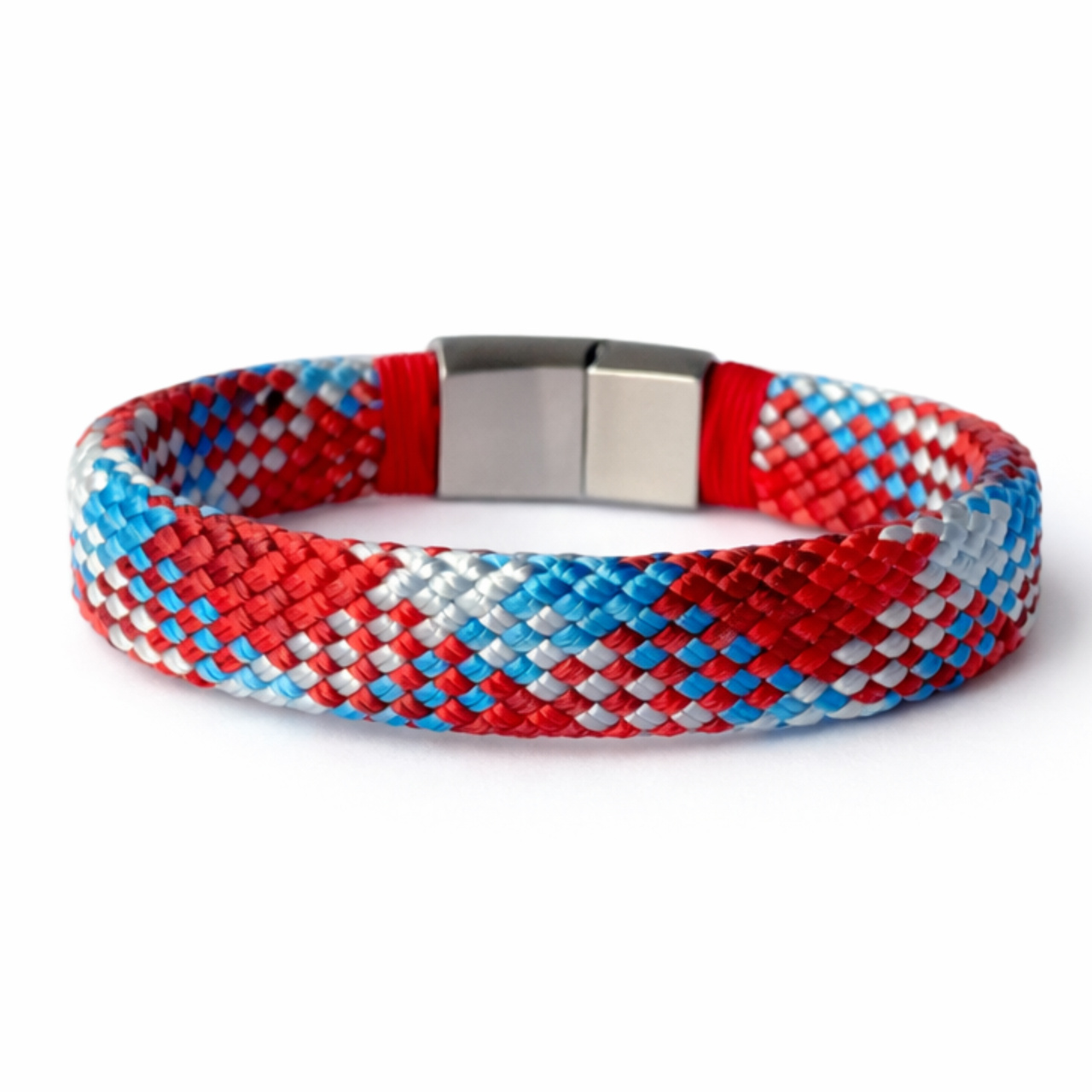 Płaska i wygodna bransoletka z flagowej kolekcji MonEgo wykonana z liny i stali w kolorach marynistycznych.